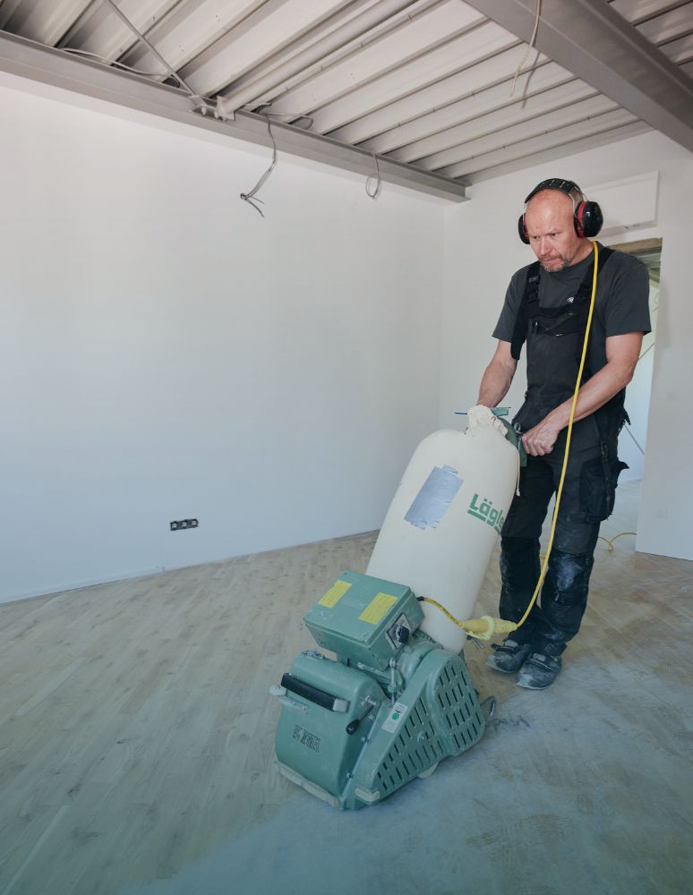 Bei der Firma Reise Know How wird aktuell in der ersten Etage rund 120 Quadratmeter Eichenparkett renoviert. Das Team von Malermeister Robin Steiner führt dabei vier sorgfältige Schleifgänge mit unterschiedlichen Körnungen durch, um eine gleichmäßig glatte und hochwertige Oberfläche zu erzielen.